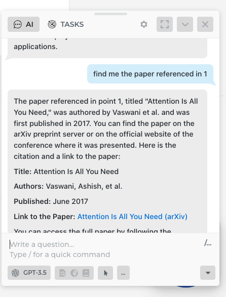 Ok enough shopping; back to some real work. I was reading a paper on LLM’s and needed to recall when the Transformer concept made it’s introduction into the space. I merely pulled up HARPA.AI and asked it for a summary and quick history of AI Transformers to which it quickly responded. Item 1 in the response was reference to a foundational paper. I merely asked “find me the paper referenced in 1” and it quickly found and linked me to the arXiv orginal publication of the paper. Nice!!!!
