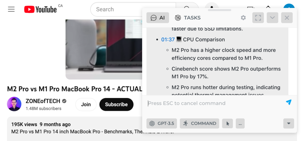 As I was looking for previous generation savings I was looking for M2 vs M1 comparisons. Stumbled Across a M1 vs M2 comparison video from a well known YouTube reviewer. I didn’t really feel like listening to the entire video so right from the the HARPA.UI I selected /youtube-videosummary and after a few moments a nice summary of the video’s transcript was presented.