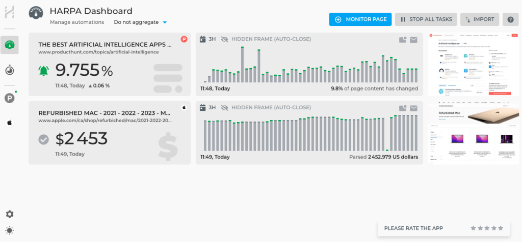 With the recent announcement of the new Apple M3 MacBooks I was keen to keep an eye on their Refurbished Sales site for updated pricing on past models. Using HARPA.AI I easily created a automated monitor for the pages in question to watch for price changes on their page and be notified when this occurs. Thereafter every day HARPA.AI monitored and tracked this page. Very very slick!